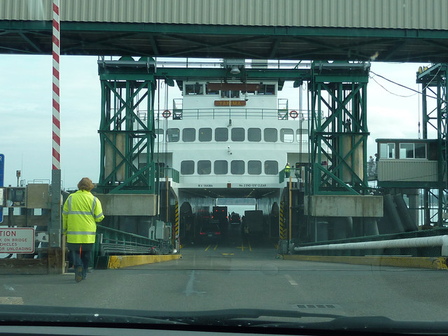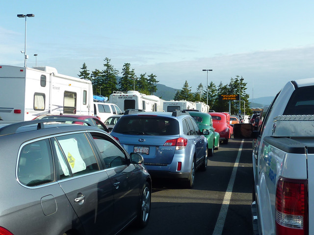 除了坐飛機之外,要前往San Juan島,得到西雅圖北邊85英哩遠的Anacortes搭渡輪。從Sammamish開車到Anacortes大約要90分鐘,為了避開上班車潮,我們一早6點多就出發,期望能坐上8:30的渡輪。說是浩浩蕩蕩真的一點都不誇張,整台車塞得滿滿的,這可是爸爸媽媽在前一天晚上就將露營行頭堆上車,出發前再掛上三台腳踏車之後的成果。網站上建議遊客提早1到1.5小時去排隊,很會拖的一家人最後仍趕不上,只能等9:30的船了。船票是來回票,汽車加駕駛53.8美金,乘客大人11.5美金,小孩9.2美金,因此一家人共花了83.7美金的船票。