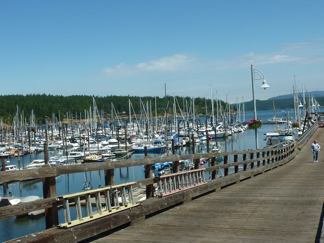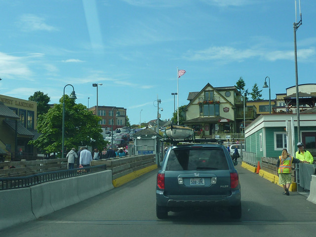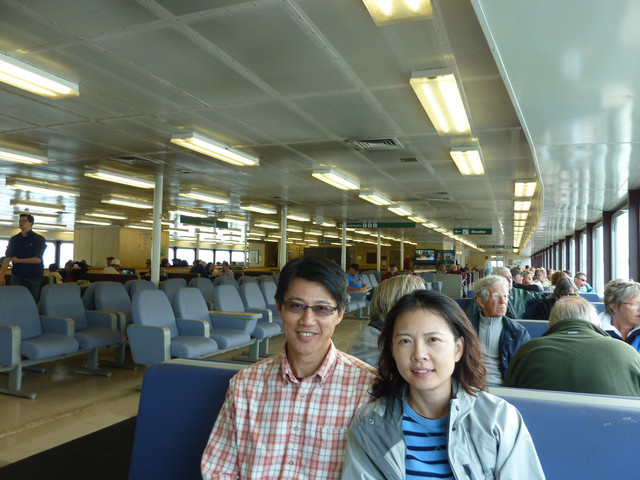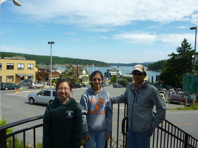 65分鐘的航行時間,一家人走上渡輪上層廣大的客艙休息,亦或到船頭看風景吹海風,亦或在客艙內看書玩撲克牌,時而出現的不同小島上的美麗豪宅也不斷吸引著我們的目光。終於快到目的地Friday Harbor,趕緊回到車上,再次蓄勢待發。在腳踏車客及步行乘客先下船後,車子緩緩開動,登上”陸地”後,首先映入眼簾的是幾棟美麗的維多利亞式建築,一旁港邊停滿白色的遊船,對映蔚藍的海水及天空,與海邊公園的綠樹及海景餐廳相襯下,嗯,很有渡假小島的風味!