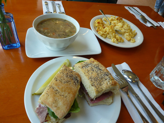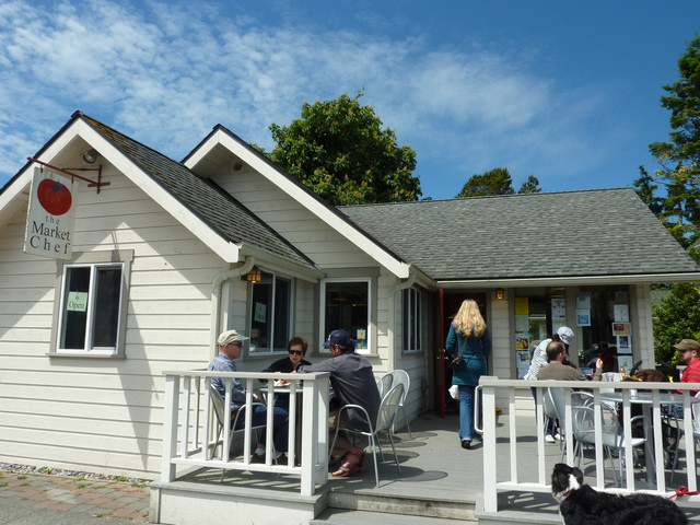 在路邊停好了車,先在Friday Harbor的市區逛逛吧。遊客不多,但是有不少特色小店。港邊的視野相當好、風景優美、涼風微拂、空氣清新、街道乾淨,逛起來很舒服。剛好經過網站上介紹的餐廳The Market Chef,聽說使用的都是當地生產的新鮮食材,價錢也便宜,於是便跟著人群排起隊,中午就在這個温馨美麗的小餐廳享用簡易的午餐吧。食材新鮮果然重要,簡單的三明治吃起來竟特別美味爽口,但較吸引女兒的是隔壁的二手書店,拗不過女兒渴望的眼神,媽媽終於答應女兒吃飽飯後先到書店等爸爸媽媽,爸爸媽媽則繼續品嚐現煮的卡布奇諾。