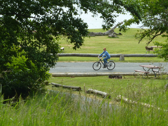可不是嘛,整個下午,一家人生蠔、玉米、煙燻鮭魚、可樂、零食吃不停,在家時媽媽可不准大家這麼吃法的,難怪女兒露營露得那麼快樂!今天天氣真是好極了,風和日麗,雖豔陽高照但相當涼爽,海面風平浪靜,景色優美的像圖畫。下方的營地有一隻大紅貴賓犬,可愛的模樣惹人疼愛,增添了不少樂趣。缷下三台腳踏車,大家開始悠閒地繞著營區騎車自娛。
