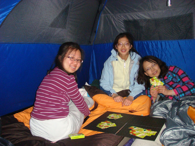 9點多了,天色也終於漸漸暗了,一家人躲進帳蓬,打算在微暗的燈光下玩"Sequence"及打撲克牌,享受另一個露營的樂趣,只是從早撐到現在的媽媽竟然一躺下就睡著了!