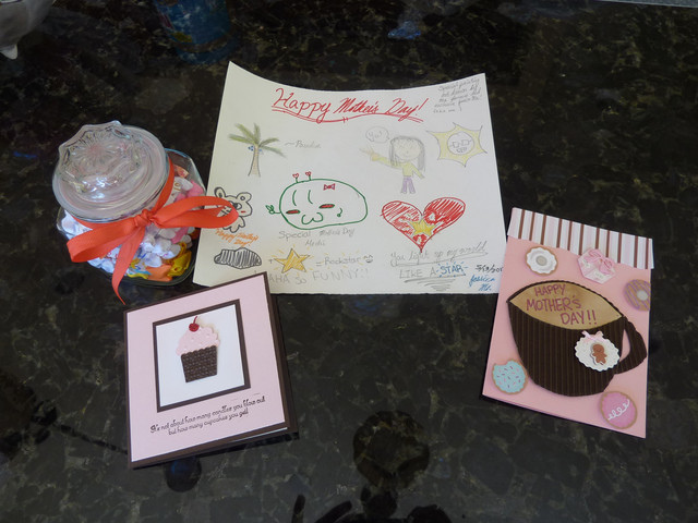 今天是母親節,2個女兒一早下樓第一件事就是獻給媽媽她們自己做的卡片及禮物。雖然我不是一個重視節日的媽媽,對於女兒在忙碌於自己的課業及陪媽媽shopping之餘不知何時還有時間偷偷製作出來的卡片及禮物,媽媽還是感動的掉下愛哭的眼淚!